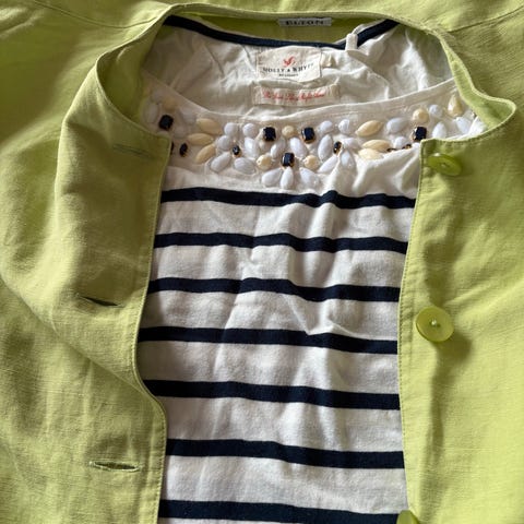 Fin linbukse med strikk i livet og nederst på bena. Flott farge til sommeren og lett og god å gå i.