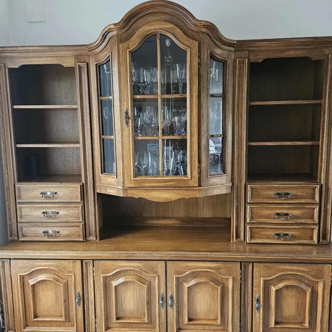 Vitrineskap i tre med tre glassdører og flere hyller. Skapet har en offwhite farge og et klassisk design som passer til oppbevaring og visning av gjenstander i stue eller spisestue.