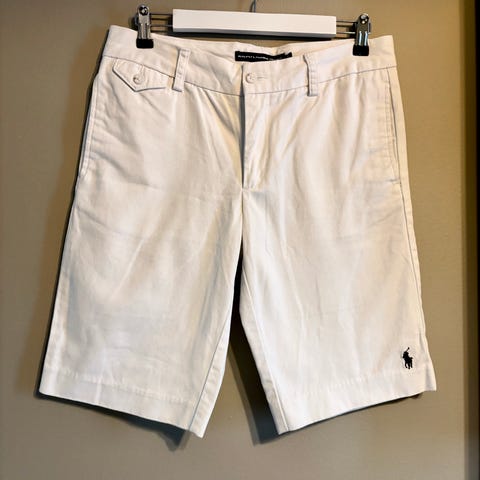 Pent brukt stripete shorts i hvit og marineblå striper fra Lauren Ralph Lauren. Kjøpt i USA. 100% polyester, men legger seg fint og lett å vedlikeholde. Str.US 6, norsk 36. Passer en 36/38.