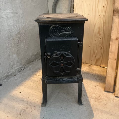 Til Salgs. Restaurert liten og dekorative kverner ovn fra ca 1900 tallet. Med fine barne motiver i sideplater. Høyde til toppen av røkrør 95 cm.. pris kr 6000. Ovnen er å hente på Grinder.