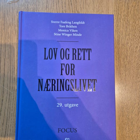 «Lov og rett for næringslivet» av Langfeldt, Bråthen, Viken og Minde (30. utgave 2023). Markeringer med markeringstusj i enkelte kapitler (se bilde nr. 4), ellers pent lest. Nypris: 849,-. ISBN: se bilde nr. 2.