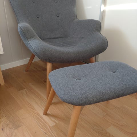 Palmetto lenestol og skammel i vakkert grønt ullstoff kjøpt ny fra Unoliving juni 2024 for kr 13.999,-. Stolen har stått ubrukt i stuen og selges kun for å gi plass til et annet møbel i en annen farge. Ingen merker eller slitasje – fremstår som helt ny.