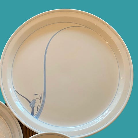 3 dype tallerkner, 1 fat, 2 potetfat, 1 serveringsfat m lokk, 1 mugge, 4 middagstallerkner, 11 asjetter, 5 små asjetter, 10 skåler, 12 kaffekopper, 1 tekanne, 4 tekopper, 8 eggeglass, salt og pepperbøsser