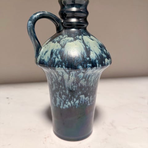 Liten, håndmalt og glasert terracotta-vase med dekor i sort og blått.