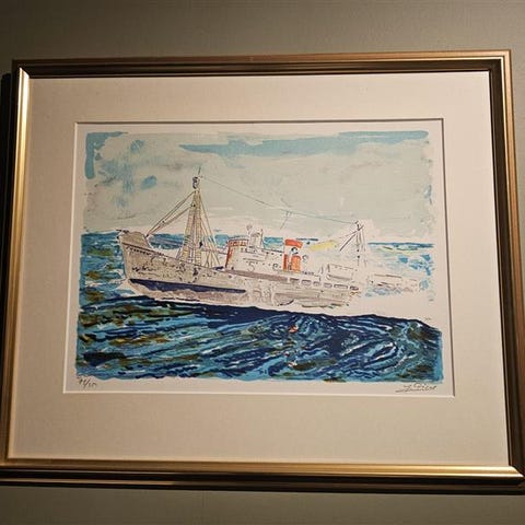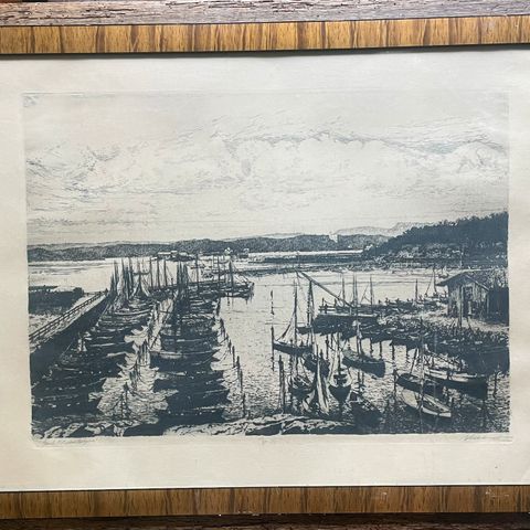 Radering av Georg Kulbeck Sohlberg. (1893 - 1958) Signert 22?.... Nr 84/150. Frognerkilen med Oskarshall i bakgrunn. Stort format med original ramme. Må hentes i Vestfold, eller bringes.
