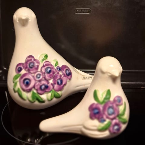 Nydelig liten keramikkfugl fra Rosa Ljung, laget på 1970-tallet. 💜 Håndmalt med lilla blomster og fine detaljer.