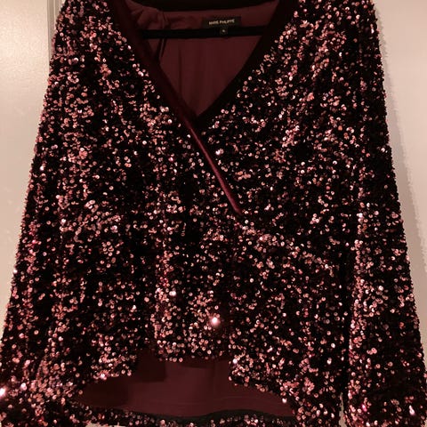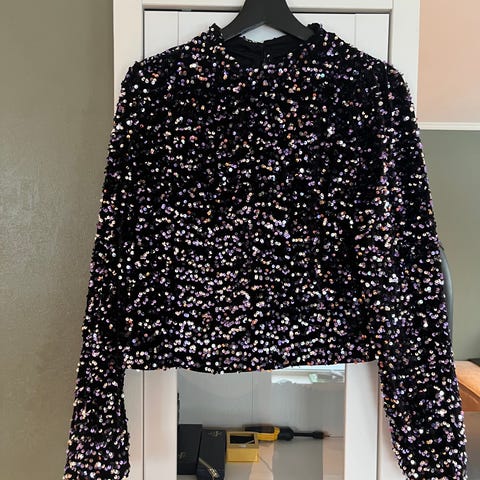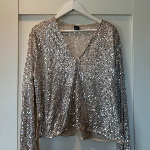 Ledig paljett topp med elastikk nederst og sydd omslagsdel. Blusen har v utringing med sydd trykknapp, samt lang arm med vidde og elastikk.