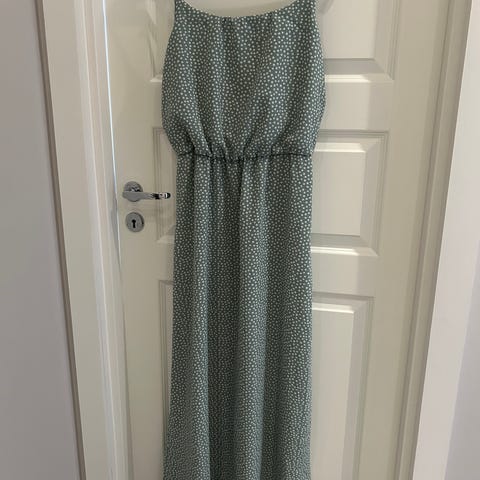 Selger en nydelig grønn kjole fra ONLY med hvitt blomstermønster. Kjolen har lange ermer, v-utringning og dekorative knapper foran. Den sitter pent over bysten og har et lett og behagelig fall. Kun brukt en gang.