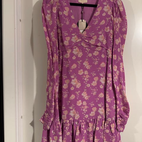 Pent brukt kjole fra ByTimo i en nydelig lys, lilla farge💜 Har en delikat åpning foran på brystet, og med trompetermer. Kjolen har et lite splitt på beinet, og har underkjole.
