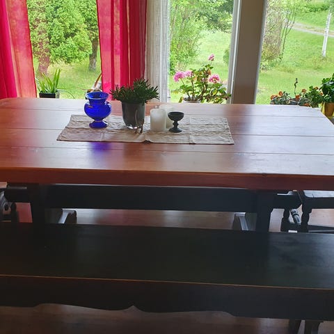 Pent brukt spise gruppe en 8 stoler. Bordet er 225 cm. når begge platene er lagt i.. Dette er en solid spisegruppe.