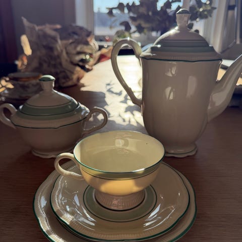 ☕️ Pris: 150 kr per sett (kopp + skål + asjett). Jeg selger én kopp, men har flere tilgjengelig – ta gjerne kontakt hvis du ønsker flere.
