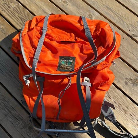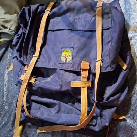 Mye sjel i denne, stropper og reimer er hele. Sekken har bruksmerker, bla kaffe(?)søl i venstre drikkelomme og innsiden av lokk er markert med forrige eier.