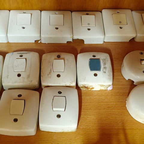 Meste parten har vært i bruk i hus. De som ligger i eske er stort sett nytt. Ypperlig for å ha som backup, eller supplerende i eksisterende hus med Eltako
