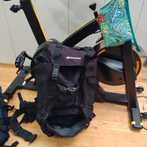 Mangler også en liten del som gjør at man kan kneppe igjen sekken ved brystet, se bilde.