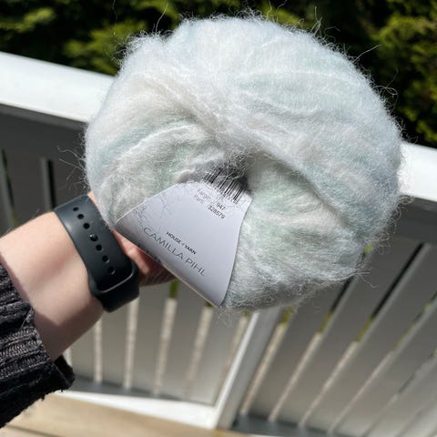 Et nøste er åpnet og strikket 4 pinner vrangbord før det ble rekket opp og nøstet tilbake.