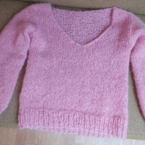 Nystrikka/ubrukt mohair genser. Strikka i viking garn. Korallfarget. Str Large.