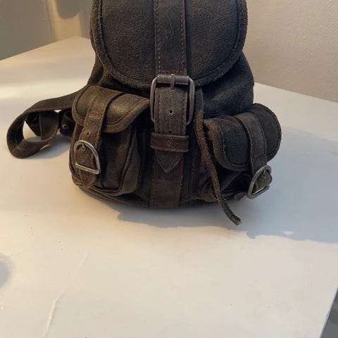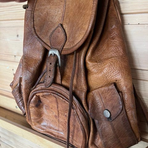 Brun flott skinnsekk selges. Den er pent brukt men har også synlig brukt stil. Mykt skinn.