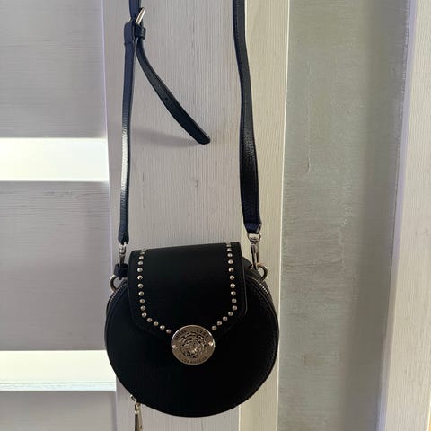 Fin, liten sort veske med skulderstropp og gulldetaljer. To hovedrom og to mindre rom (en med glidelås). Kjøpt i utlandet. Ubrukt og fremstår som ny.