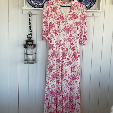 En superfin kjole til sommerfest eller bryllup 🌺 Fine trekte knapper, glidelås i ryggen, markert midje og helforet med rosa stoff inni. En drøm av en kjole! Str er 34, men den er liten i størrelsen vil jeg si. Mer str XXS tror jeg. Kan ta mål ved interesse. Kan sendes.