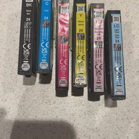 Epson blekkpatron til printer. Fargen svart og gul, uåpnet.