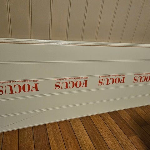 Spesialskåret panel med Halden-profil til utvendig bruk. Liggende. Grunnet og malt en gang med lys antikk, fargekode: NCS S1502