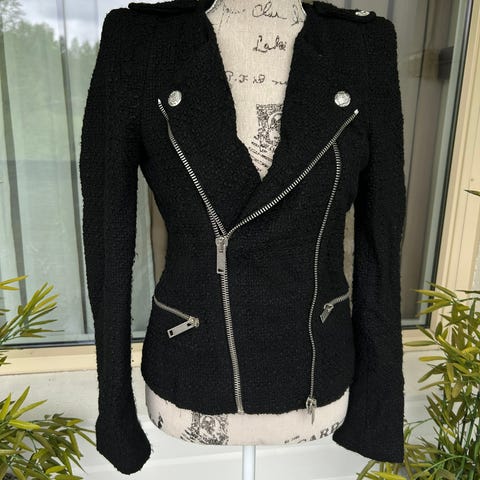 Cardigansett i lys beige med små perler øverst både på topp m stripper og på Cardigan, kvalitet: 80% viskose og 20% nylon. Str M. Lite brukt,