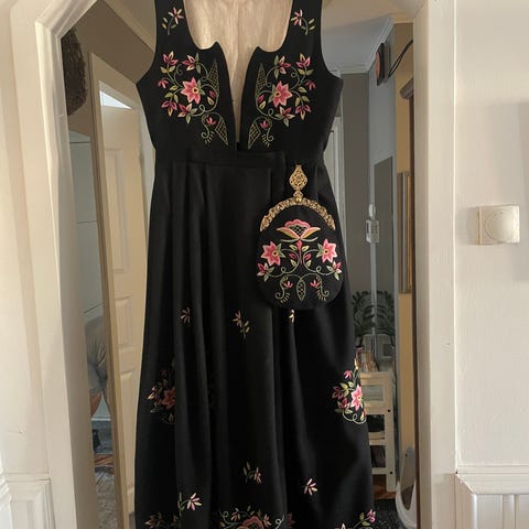 Hedmarksbunad modell 1935 selges. Fin bunad i god stand sett bort fra et lite hull,se bilde. Vest,stakk, underskjørt,sjal,veske og original skjorte. Skjorten er hel og fin men er selvfølgelig pga alder ikke drivhvit lenger.