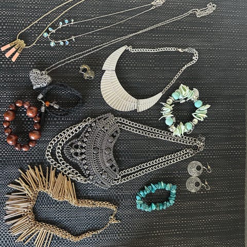 Selger kostymesmykker: armbånd, kjede, hårnåler, øredobber og diverse annen smykker