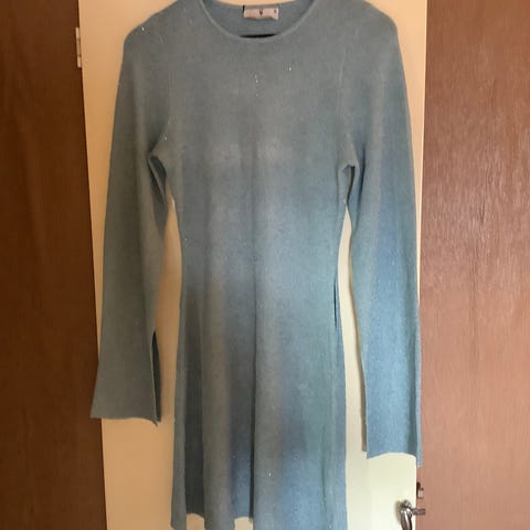 En nydelig kjole fra Noa Noa i en dyp sjøgrønn farge. Ermene har et veldig fint strikket mønster. Rekker ca ned til knærne. Løs i formen, men sitter likevel fint på. Både deilig å ha på og fin til å gå ut med. Den er brukt, men av god kvalitet og formen og strikket er fortsatt fint og har holdt seg godt.