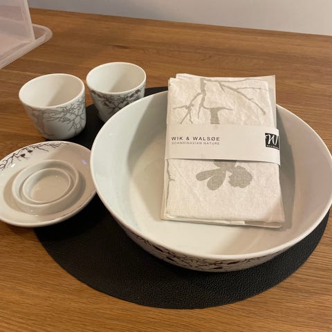 Selges en ubrukt reinsdyr frokost servise. Handpainted. Litt krakelering.