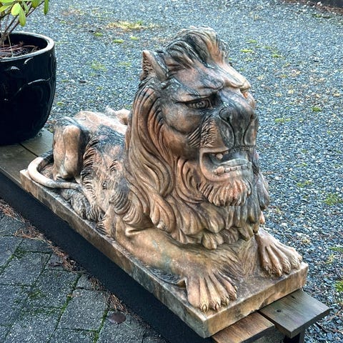 125cm lang, 100 cm høy, 40 cm brei. Estimert fra 70-110 kilo. Denne ble laget i California etter en model som kun er brukt 1 gang, Altså ett meget unikt dekor. Kostnaden i rundt år 2004 lå på 100 000 utenom moms og frakt. Hær er den ultimate dekorasjonen til deg om elsker hunder.