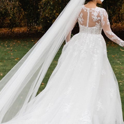 Selger verdens fineste brudekjole i str S. Klassisk uttrykk med lange ermer og blondestoff. Siluetten fremhever midjen din og gir et rent og elegant preg på bilder. Brukt en dag og renset etterpå.