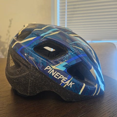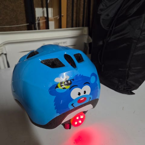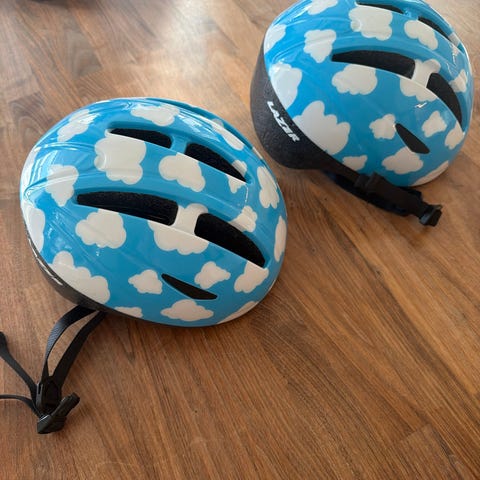 Hjelmen er i størrelse S og veier 270 gram. Den ble kjøpt ny og brukt av én forsiktig liten syklist. Den er ikke utsatt for fall, og er i god stand – med kule regnbuestriper og teksten “Future World Champion” på siden.
