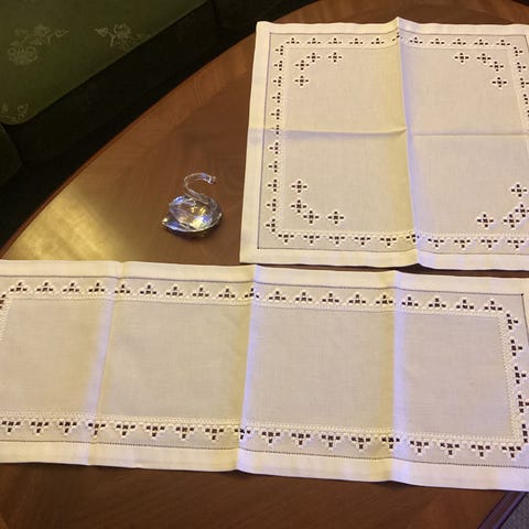 Lene Bjerre innleggsputer (3), putetrekk (4), dekkebrikker (4), duk (1) og en pakke matchende servietter. Selges samlet.