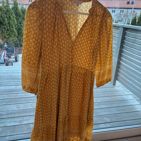 Nydelig sommerkjole fra Missmaya i et fint stoff som faller pent. Smocking i toppen, knyting på ermene og lommer i siden. Den rekker til ca midt på leggen. Veldig behagelig på og flatterende snitt.