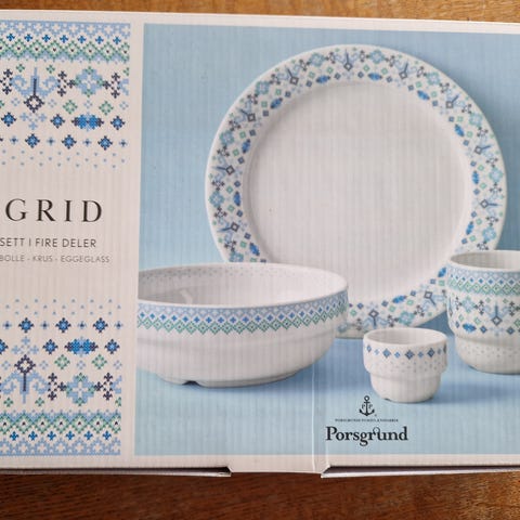 Har fire deler: tallerken, bolle, krus og eggeglass. Inspirert på norske bunader.