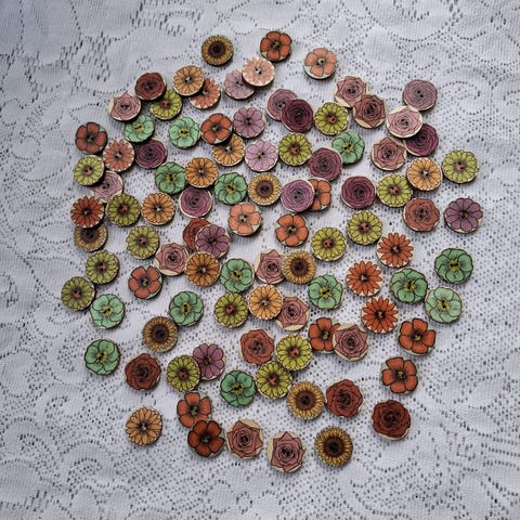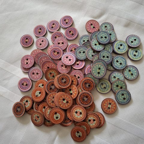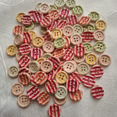 100 hjerteformede treknapper i mixfarger - Har flere av disse knappene, så tilfeldig mix av farger i hver pk.