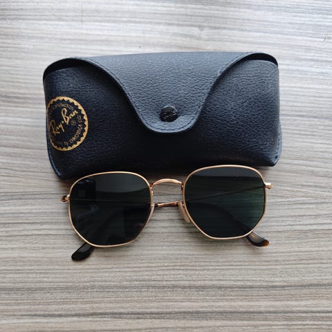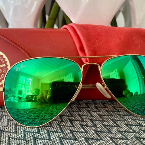 Polariserte Ray-Ban Aviator av modellen RB 3025 med fargekode 112/06. Skiller seg tydelig fra den mer vanlige RB3025 112/85. Glassbredde 58 mm, nesebro 14 mm. Gullfarget ramme. Sort RayBan etui og uåpnet pusseklut medfølger.