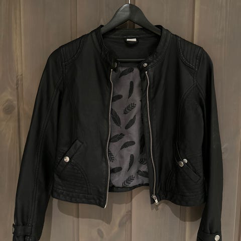 Selger denne rosa ubrukte skinnjakken fra Lindex. Ikke lappe på, men den er ubrukt. Var så sikker på at min datter ville ha den🙈😁så feil kan en ta.