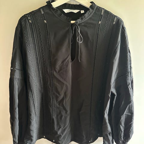 Pent bruk skjorte/bluse fra High. Snøring nedentil og knepping bak. Lommer i siden og kan puffes litt opp. Fin rysjekant rundt hals. Knepping nederst på erme.
