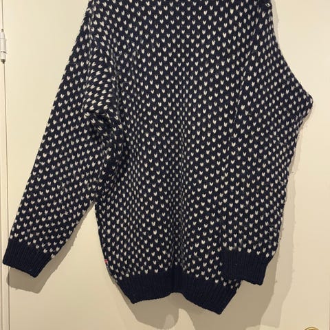 Jeg er midt mellom L og XL, og denne genseren er en liten L eller stor M. Det er ekte hjemmestrikk og størrelser er ikke en nøyaktig vitenskap i det gamet.