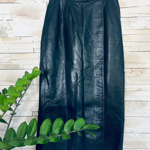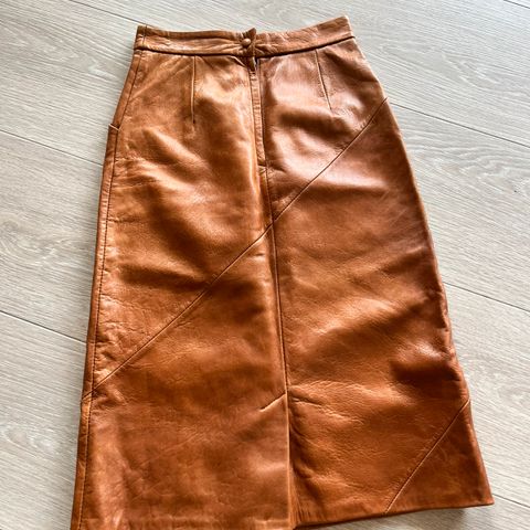 Brunt skinnskjørt fra Friitala. Knapp. Glidelås og splitt bak, og lommer på forsiden.