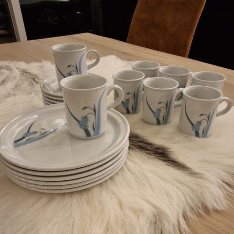 Selger litt sjelden kombinasjon av dette kaffeserviser pga med blå Kaffeasjett. Hele servise kr.1000.- kan selges i enkelte kuverter til 170 pr kuvert
