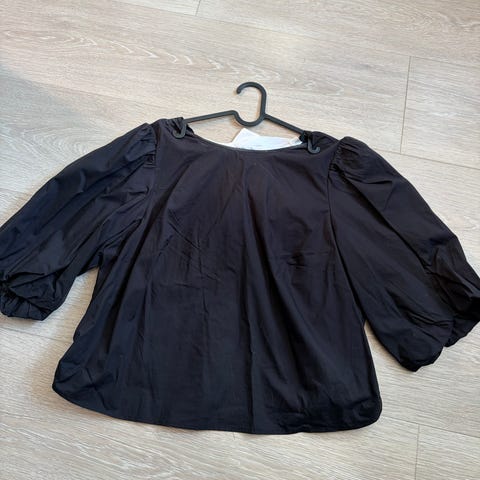 Zara bluse i svart, størrelse 36 for dame. Blusen har et moderne design med vide ermer og en knyting i ryggen. Egnet for både hverdagsbruk og spesielle anledninger.
