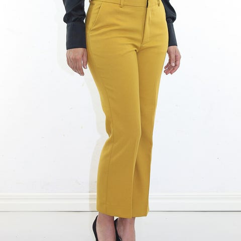 Bukser i gul farge for kvinner, størrelse S. Materialet har en strukturert overflate som vises på nærbilde. Passer til daglig bruk og ulike anledninger.