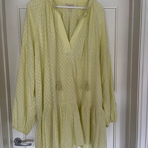 Nydelig kjole i engelsk blonde fra Holly&Whyte i størrelse XL. 100% bomull. Så fin at den til og med kan brukes som casual brudekjole om du ønsker en hvit og romantisk kjole til rådhus og selskap/middag. Pent brukt, ingen slitasje eller bruksmerker. Jeg er 1.65 og kjolen rekker til godt under kneet, men ikke helt ned til midt på leggen. Passform er løs og ledig, ikke tettsittende, men den har likevel en flatterende siluett.