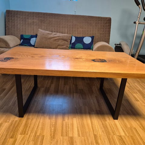 Salongbord laget av møbelplater trukket med naturlig eikefiner. Hele møbelet trukket med dekorativ olje, messinghåndtak. Fire skuffer. Unikt møbel laget i et snekkerverksted, mulighet for å lage en annen størrelse på forespørsel.