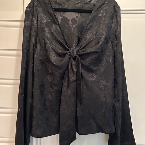 Bare brukt en gang. Som ny, hvit skjorte med åpne skuldre, og nagler på kraven. Veldig fin på. Bik bok, 100% polyester