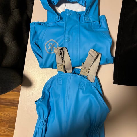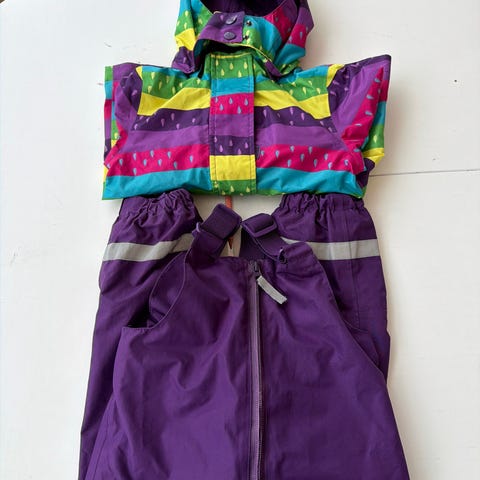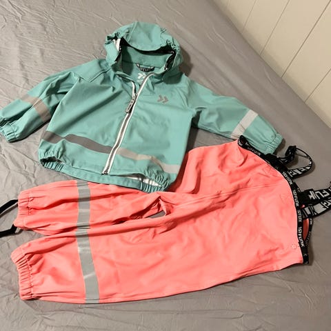 Sett med regnbukse fra Kids World str. 92 og regnjakke fra My Wear young str. 98/104. Passer fint sammen. Jakka var favoritt og er godt brukt mens buksa er nærmest ny, om ikke helt ny 🙂