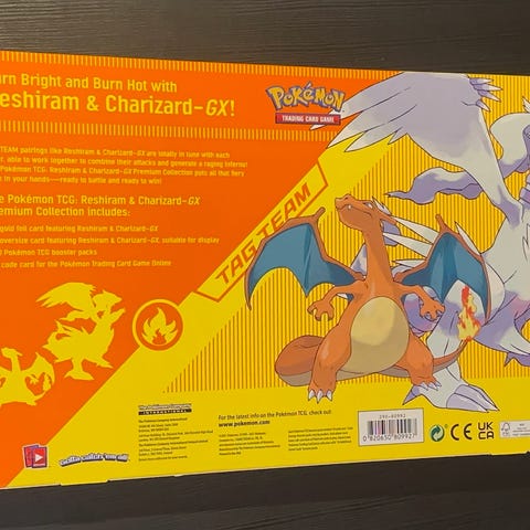 Selger en ubrukt og forseglet Reshiram & Charizard-GX Premium Collection fra Pokémon TCG, Perfekt for samlere eller spillere som vil ha noe spesielt!